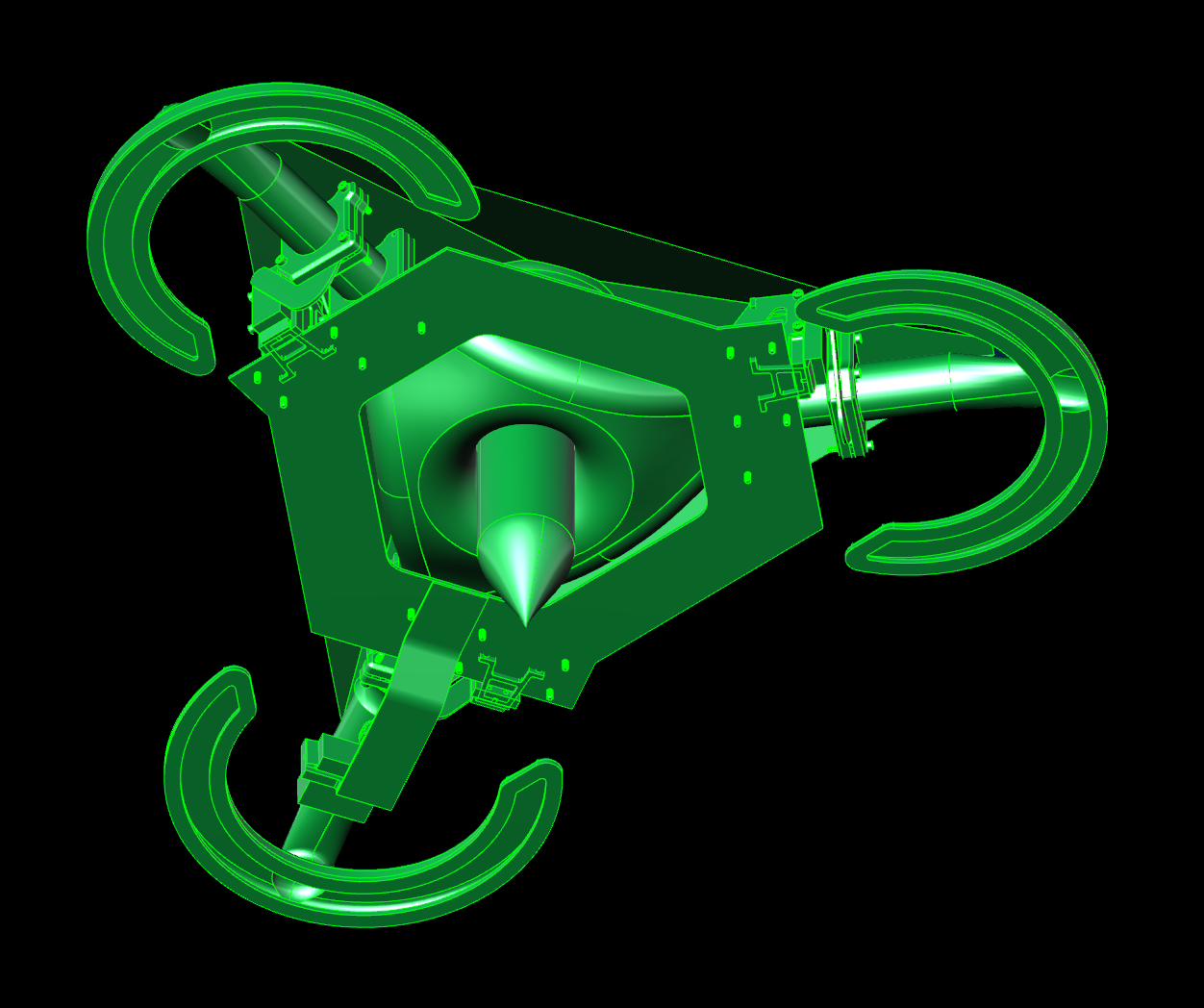 THE NUCLEAR POWERED (MINI REACTOR) CRAWLING EXTRUDER, ONCE DEPLOYED, IS “TETHERED” BY A LASER BEAM TO THE ANCHOR POINT IN THE SENSOR HEAD OF THE “SHEPHERD BOT”, WHICH IS LOCKED ON ITS SPOT. ONCE COPIED ITS POSITION, THE MACHINE STARTS TO CRAWL AND EXCAVATE THE SOIL FROM BENEATH OF ITSELF, GRINDS AND MIXES IT WITH A BONDING AGENT AND SLOWLY EXTRUDES INTO PRE-DETERMINED, CONSTANT DOMED PROFILE OF THE STRUCTURE, WHICH IS OPTIMIZED FOR RADIATION PROTECTION, DIRECT SUNLIGHT BLOCKAGE, AS WELL AS BECOMES A NATURAL SOLUTION FOR THERMAL BALANCE OF THE SEALED HABITABLE SPACE BELOW. IN THE SPECIAL CHAMBER, THE EXTRUSION IS THEN BOMBARDED BY HIGH PRESSURE HIGH TEMPERATURE CO2 FLUE THAT GLASSIFIES SURFACE LAYERS FOR STIFFNESS. WITH THIS THE MACHINE CRAWLS AND BUILDS THE SUBMERGED STRUCTURE BEHIND; THEN SHEPHERD BOT COMMANDS IT TO TURN, AND TRAJECTORY FORMS A SPIRAL - A GEOMETRIC DEFINITION OF AN INFINITE GROWTH.