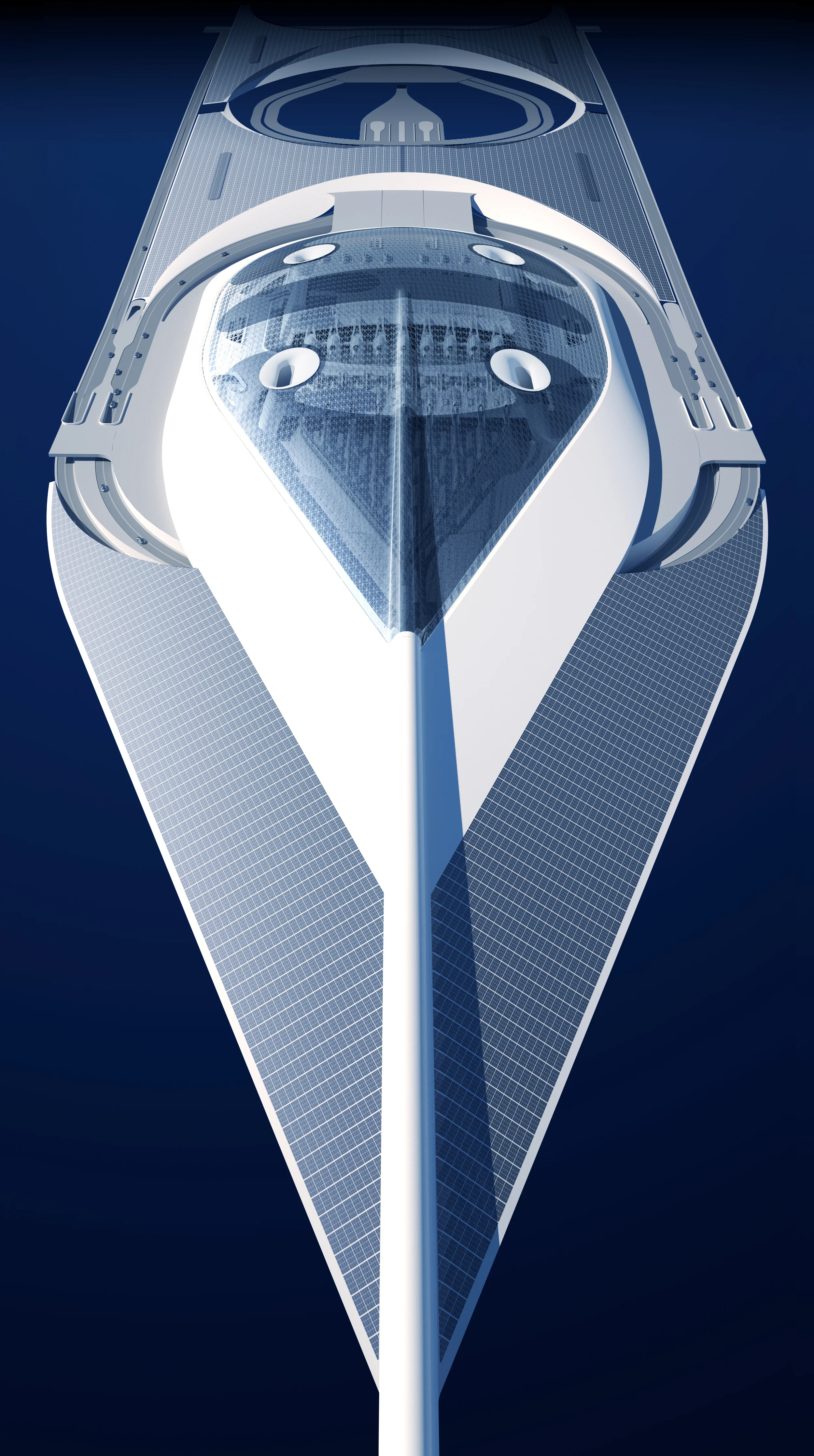 IN THIS PROJECT AESTHETICS WAS THE MAIN ASPIRATION. THE GOAL WAS TO ACHIEVE A SLEEK, SHARP SILHOUETTE WITH NO SIGNS OF HUMAN PRESENCE SUCH AS PORTHOLES OR OTHER APERTURES AND OBJECTS COMMONLY SEEN ON A BOAT'S DECK. ALL MECHANISMS ARE MADE RETRACTABLE, AND BEADS ARE RATHER TALL, HIDING THE DECK BEHIND. ALL FACILITIES - AS WELL AS LEISURE FUNCTIONS -ARE DESIGNED TO BE LOCATED BELOW THE DECK LEVEL, AND LIT THROUGH SKYLIGHTS. THE KEEL OF THE BOAT IS NOT ONLY AESTHETICALLY DISTINCTIVE, BUT ALSO OPTIMAL FROM HYDRODYNAMICS' STANDPOINT.