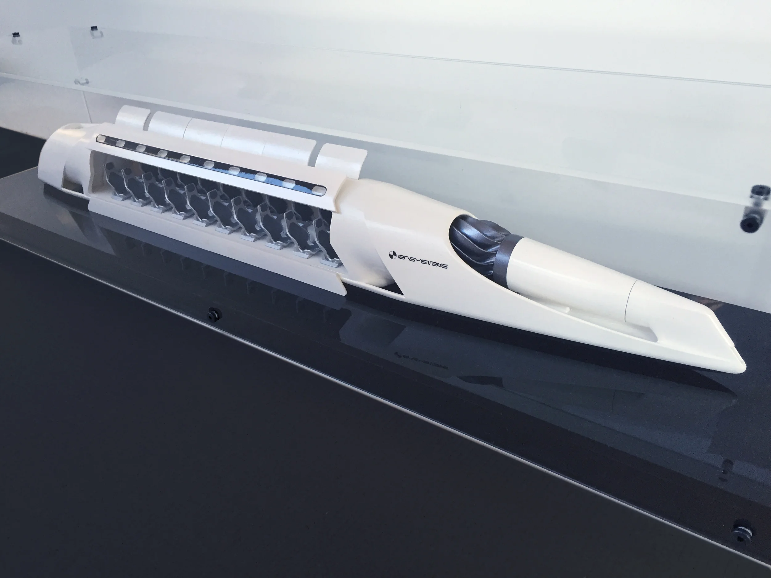 The goal for the pod's design was to come up with a user-friendly, non-aggressively looking machine that would appeal to many categories of travelers; a design that does not remind of a flying engine, but rather an elegant hybrid of an airplane with a high-speed train. A lot of consideration was given to aerodynamics for the nose - the compressor's impeller is exposed and its blades are designed to be bulging out off of design surface to provide boundary layer suction, greatly reducing the surface drag along the entire pod's body behind the impeller; the impeller is housed in a round nacelle that is partially covered by body panels blended with the end of the nose; behind the impeller are also the gills that evacuate an excessive flow and push it against the walls of the tube to provide additional lateral stabilization. The aerodynamic concept is theoretical, but was proven effective in a low-resolution CFD test. The engine's compressor is a spiral volute, in a turbo-like principle, to occupy less space within the vehicle. Propulsion and levitation systems are not addressed in detail, but conceptually laid out as electric and air skis, respectively, in accordance with proposals in the Alpha paper.
