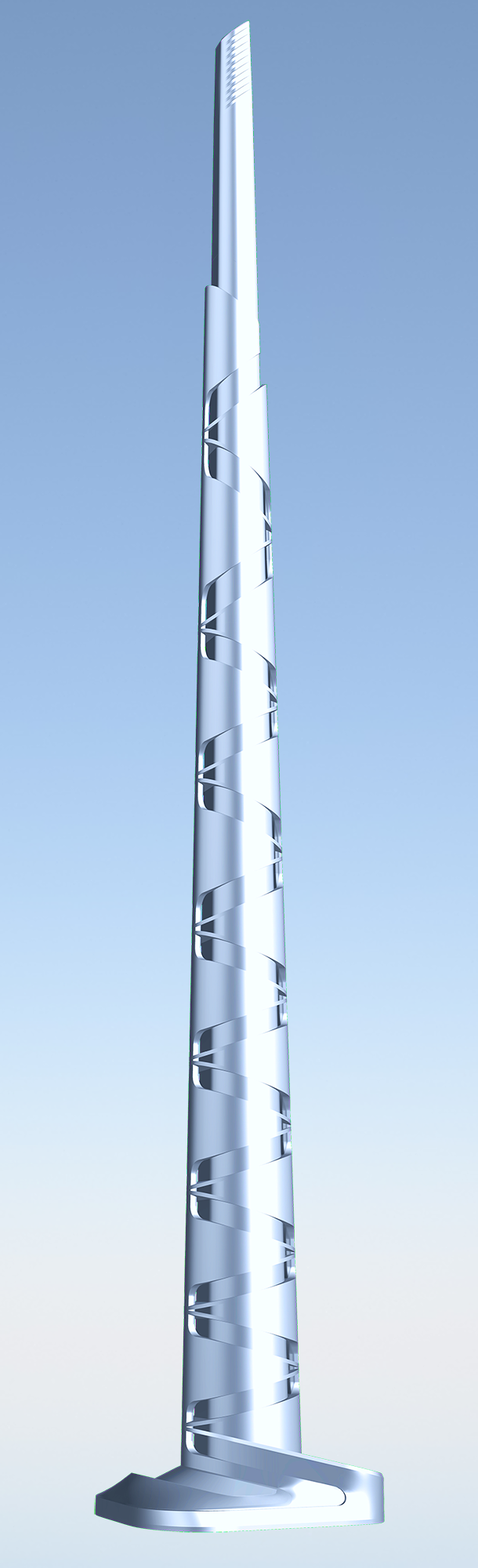 CURRENT WIND TURBINE APPLICATIONS IN BUILDINGS ARE USUALLY ABLE TO UTILIZE WIND THAT BLOWS ONLY IN ONE DIRECTION. THE ABSTRACT BEHIND THIS STUDY WAS TO INVESTIGATE A METHOD BY WHICH THE CHAOTIC, MULTI-DIRECTIONAL WIND OCCURING IN URBAN ENVIRONMENTS CAN BE EFFECTIVELY MANIPULATED. GIVEN THAT AIR IS A FLUID, AS ANY FLUID IT WOULD STICK TO AND FOLLOW A SURFACE TO WHICH IT IS APPLIED \ DIRECTED. TO WHICH THE BEST EXAMPLE IS “COANDA EFFECT” IN AERODYNAMICS. THEREFORE, THE SHAPE OF A BUILDING CAN BE CONFIGURED TO MANIPULATE THE FLOW. THE TOP OF TOWER IS AN ENERGY SPIRE, A WINDFARM, AND IS SHAPED ACCORDINGLY - AS A SCREW, ONTO THE SPIRAL THREAD OF WHICH THE WIND MASS IS BLOWING AND THEN TRAVELS UP AND DOWN, FOLLOWING THE SURFACE AND GETTING DRAWN INTO THE CHANNELS WITH WIND TURBINES, SPINNING AS MANY OF THEM AS POSSIBLE REGARDLESS OF THE PREVAILING WIND DIRECTION OR UNIFORMITY OF THE FLOW.